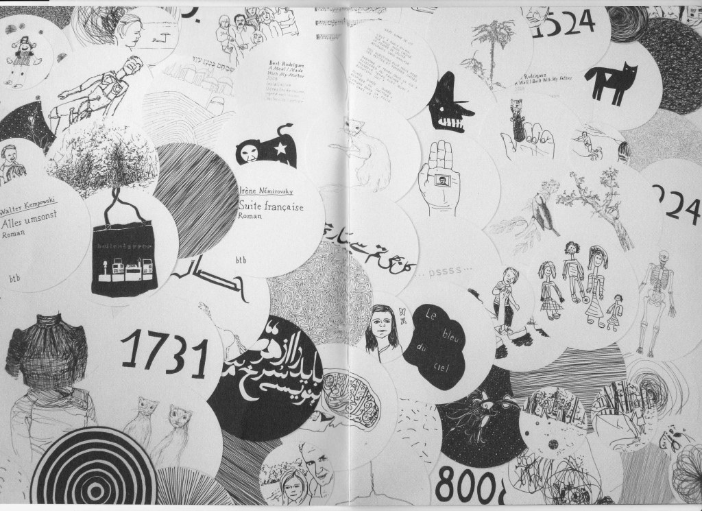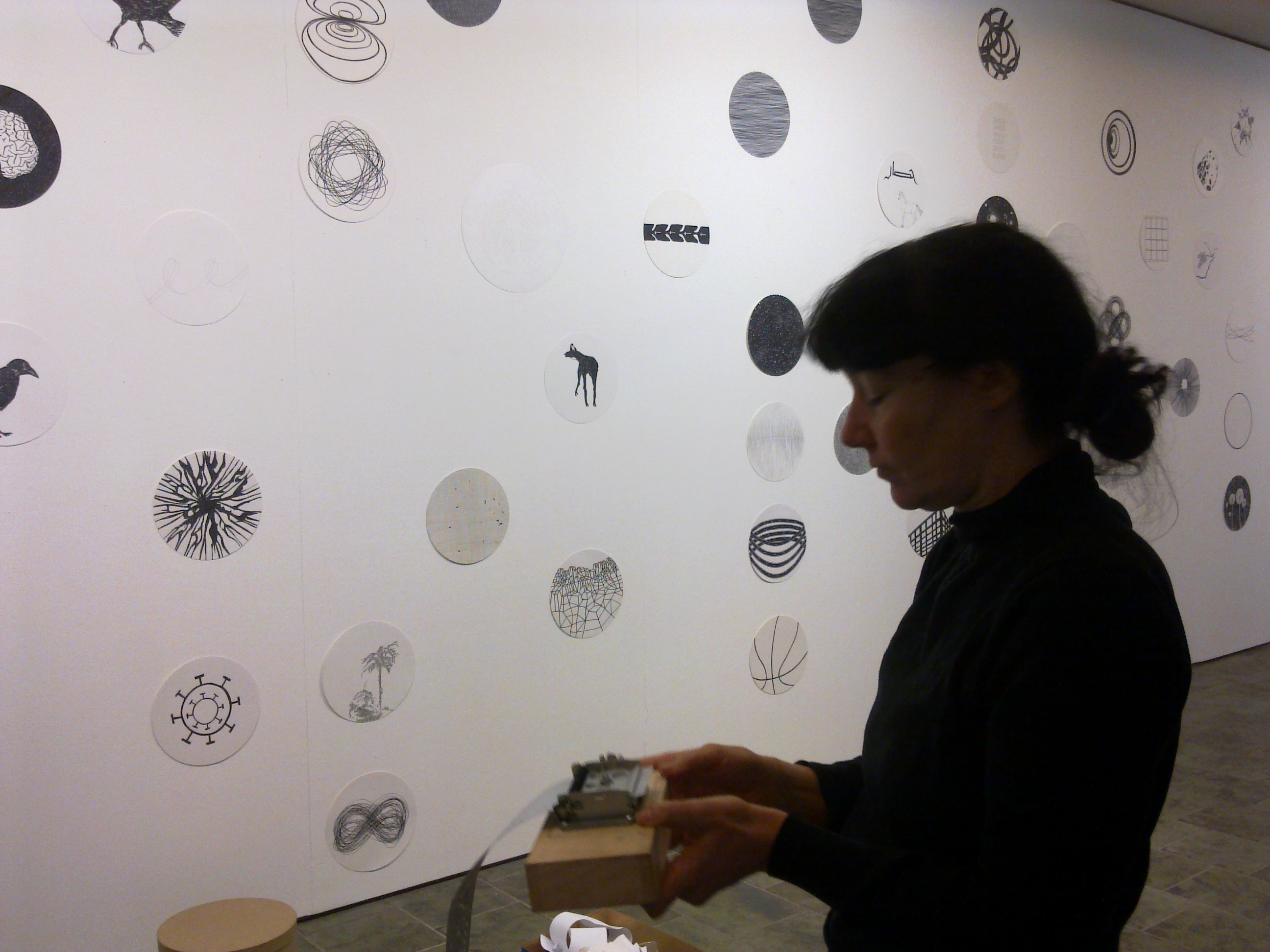 Seit 1999 zeichnet die in Stuttgart lebende Künstlerin täglich mit schwarzem Stift visuelle und akustische Eindrücke auf weißen, kreisformatigen Karton, der das Format von Langspielplatten und Singles besitzt.