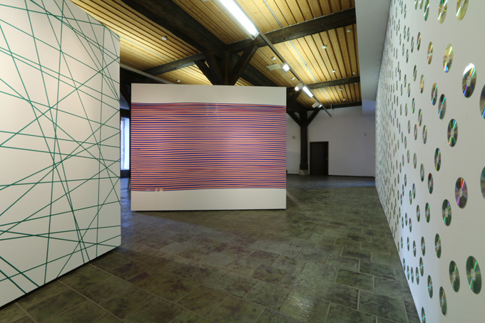 Mit Klebebändern bearbeitet oder mit hunderten CD-Rohlingen bedeckt, werden diese Wände zu Bildobjekten im Raum. Einfache, repetitiv durchgeführte Klebevarianten der Bänder lassen hierbei komplexe Bildsituationen entstehen, die den Betrachter teilweise an den Rand seiner Wahrnehmungsleistung führen.