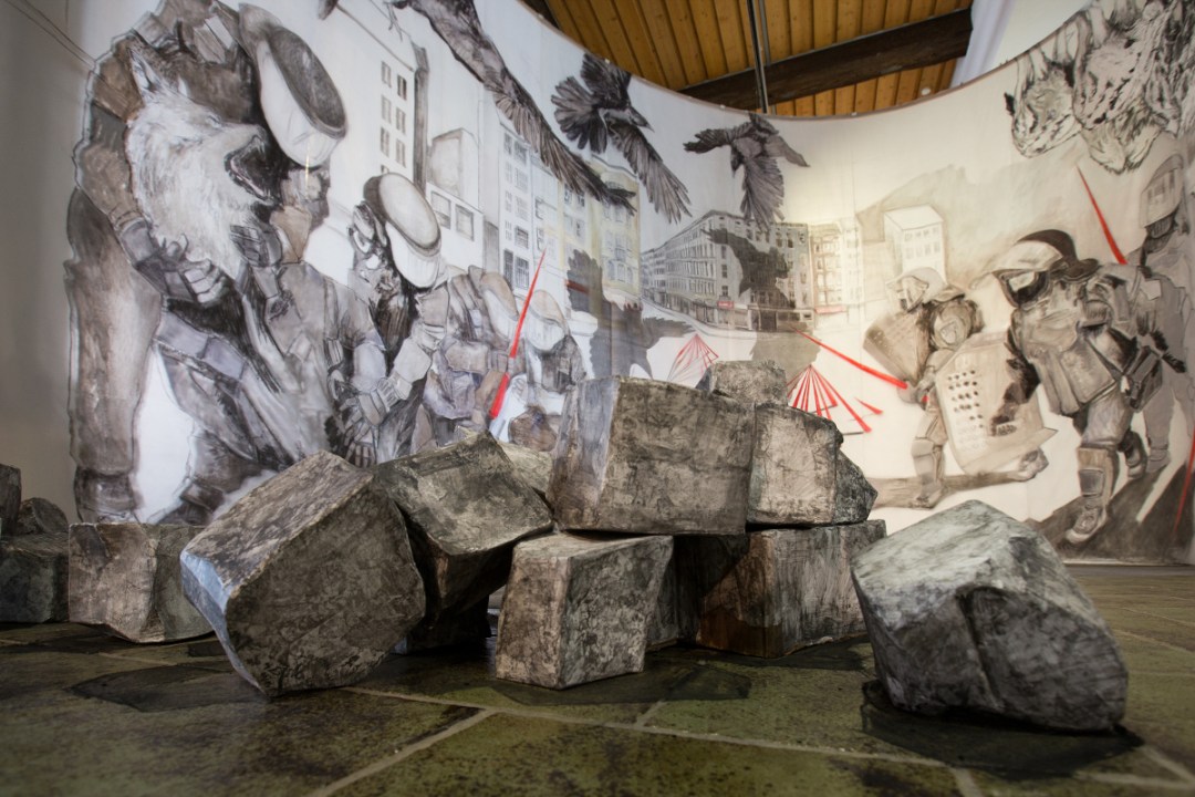 Tine Schumanns Arbeiten erzählen von Verunsicherung. Einer Verunsicherung als Folge von Veränderung. Aggression und das öffentliche Aufeinanderprallen von Masse und Meinung sind auf den Straßen der Großstadt alltäglich – in Kirchheim vielleicht etwas weniger. Durch die permanente Präsenz von Gewalt und Leid in den öffentlichen Medien, ist diese inzwischen wohl auch hier ein Thema.