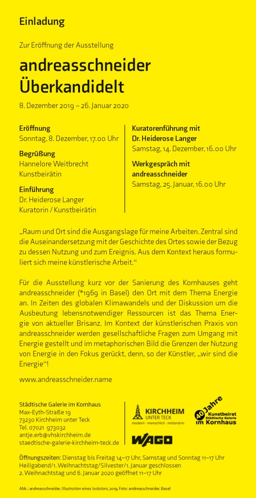 Das Herbstprogramm 2019 beginnt mit einer Diskussionsveranstaltung am Samstag, 21. September 2019 zum 40jährigen Bestehen der Städtischen Galerie im Kornhaus und des Kunstbeirates. Ende Oktober folgt die Ausstellung mit LINIENSCHAREN, einer offenen Plattform von Künstler*innen, die sich zeichnerisch mit der Linie auf der Fläche und im Raum befassen. Das Ausstellungsjahr 2019 wird mit einer Installation aus Leuchtstoffröhren und zwei mannshohen, aus Holz gedrechselten Isolatoren des Basler Künstlers andreasschneider abgerundet, der das Thema Energie aus unterschiedlichen Perspektiven beleuchtet.
