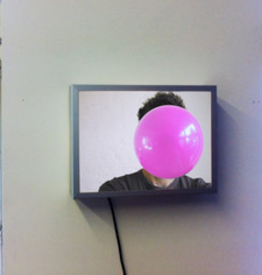 Das Besondere daran: Das jeweilige Gesicht wird durch einen farbigen Luftballon verdeckt, dessen Farbe jede/r Porträtierte als die für ihn/sie passende auswählte.