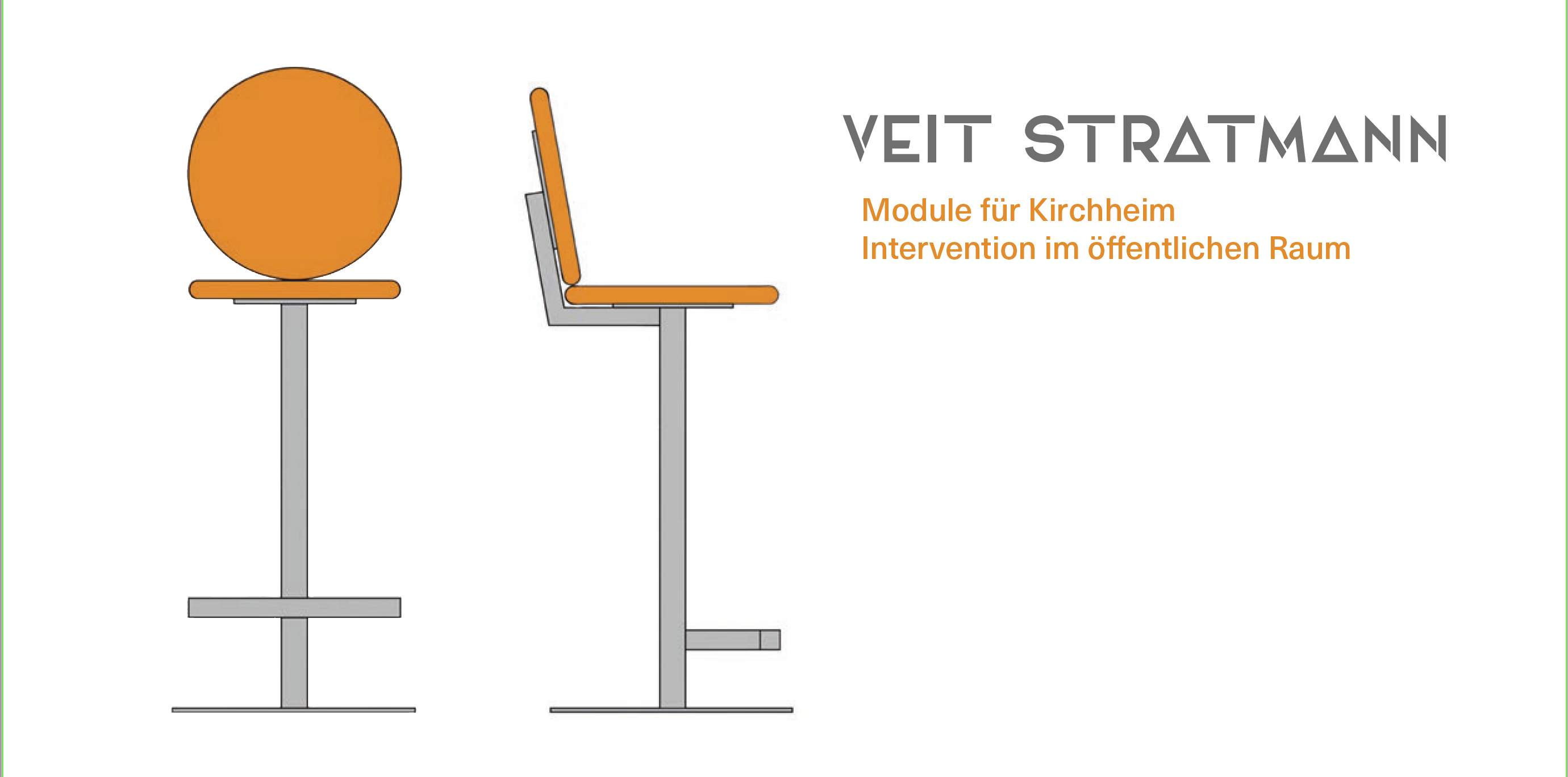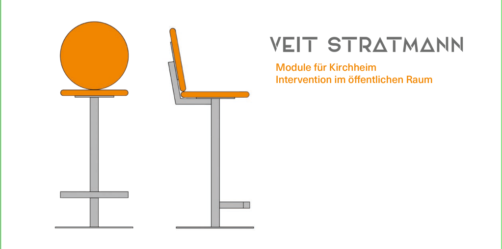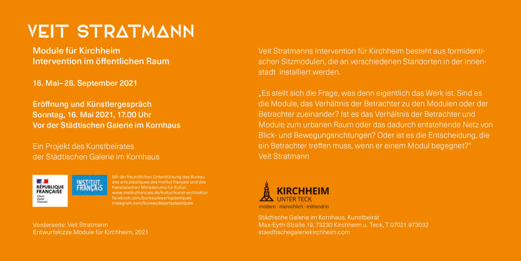 Mit seinen orangefarbigen Modulen stellt Veit Stratmann ästhetische Bewertungskriterien und Wahrnehmungsprozesse im Handlungsfeld von Kunst, öffentlichem Raum und soziokultureller Erfahrungen zur Diskussion. Unter #StratmannInKirchheim können Besucher auf Instagram und Facebook ihre Fotos der Sitzmodule teilen.