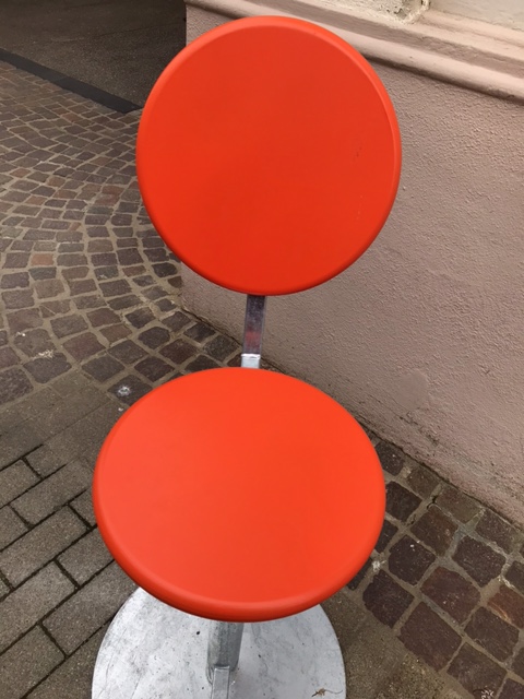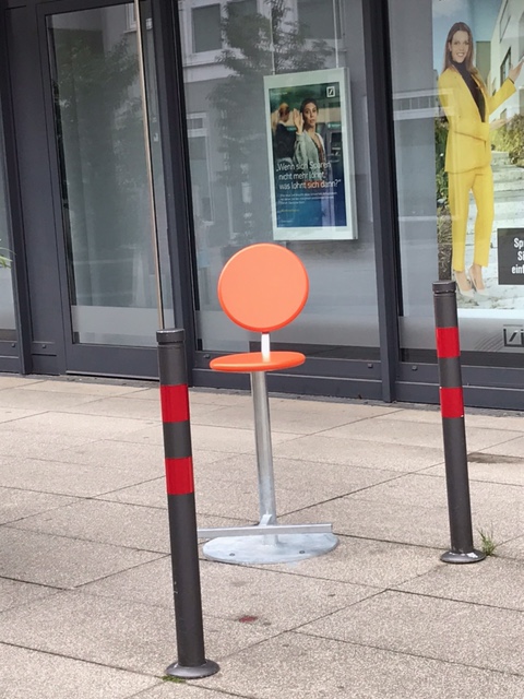 Die Module bestehen aus galvanisiertem Stahl. Rückenlehne und Sitzfläche sind gleich große Stahlblechelemente, konstruiert aus zwei gegeneinander geschweißte „Hohlschalen“. Diese Module sind einerseits einfache, auf das technisch Notwendige reduzierte Formobjekte und damit unauffällig. Andererseits sind sie durch ihre Höhe, die orangefarbene Lackierung der Sitzflächen und der Rückenlehnen sowie ihre Einzelstellung sehr sichtbar und auffallend. Ein Passant kann bei seinem Gang durch die Innenstadt mehreren Modulen nacheinander begegnen, sie wahrnehmen und eine Verbindung zwischen ihnen herstellen. Damit werden die Module zu Ankerpunkten einer neuen innerstädtischen Struktur, zu einem immateriellen Netz aus Wegstrecken, Blickrichtungen und Erinnerungen. Und da jeder Besucher der Innenstadt den Modulen in unterschiedlicher Geschwindigkeit, auf verschiedenen Wegen und in anderer Reihenfolge begegnet, kann das Netz, trotz seiner Verankerung, eine Vielzahl diverser Formen annehmen. Mit jedem Gang durch die Innenstadt ziehen Passanten neue Stränge in das Netz, verändern und verdichten es aktiv. (Heiderose Langer)