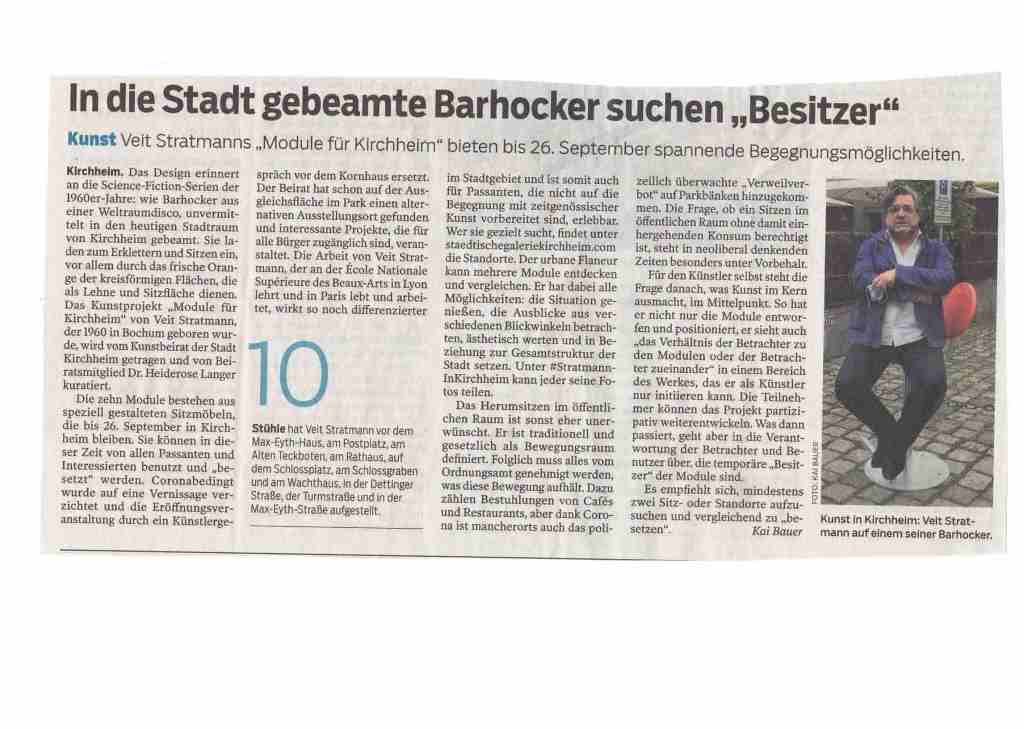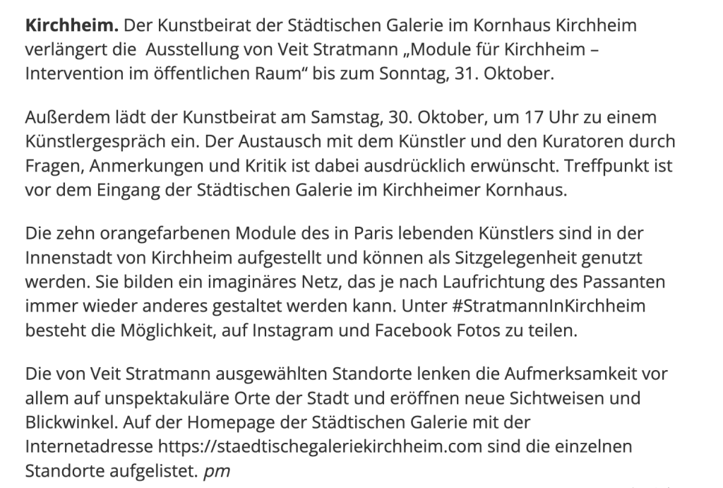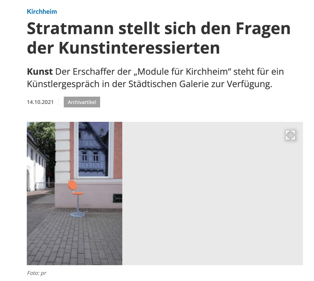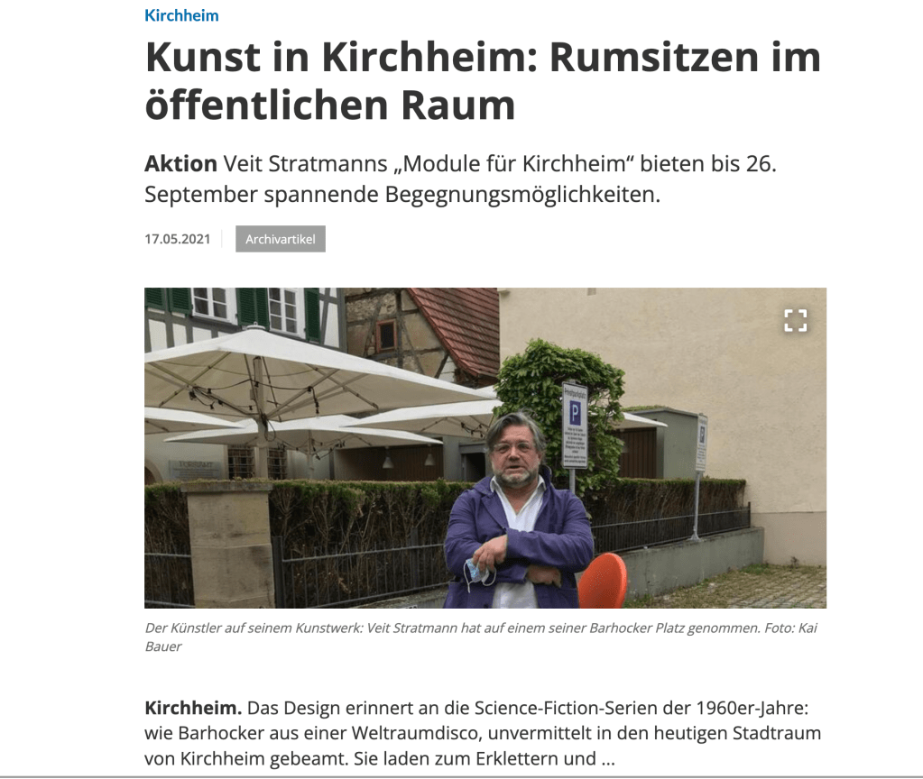 Veit Stratmanns künstlerische Intervention umfasst 10 formidentische Sitzmodule, die an verschiedenen Standorten einzeln in der Kirchheimer Innenstadt fest im Boden verankert werden und sich als Angebote zum Innehalten und Sitzen verstehen.