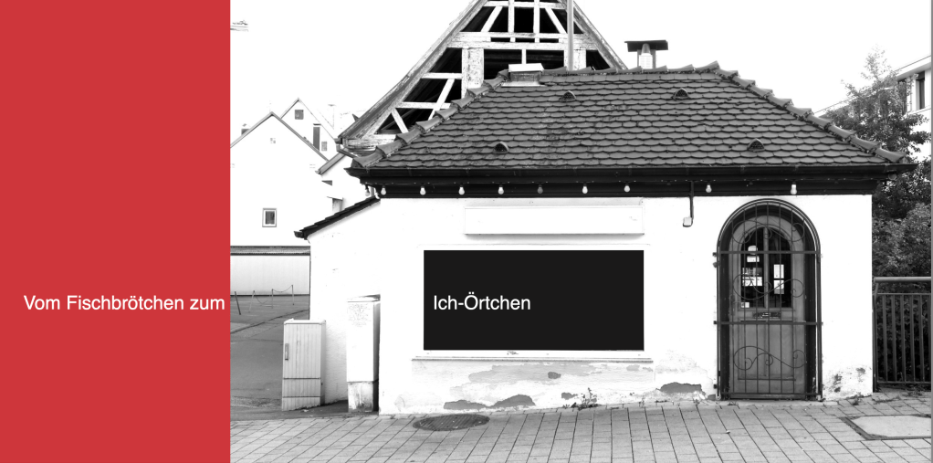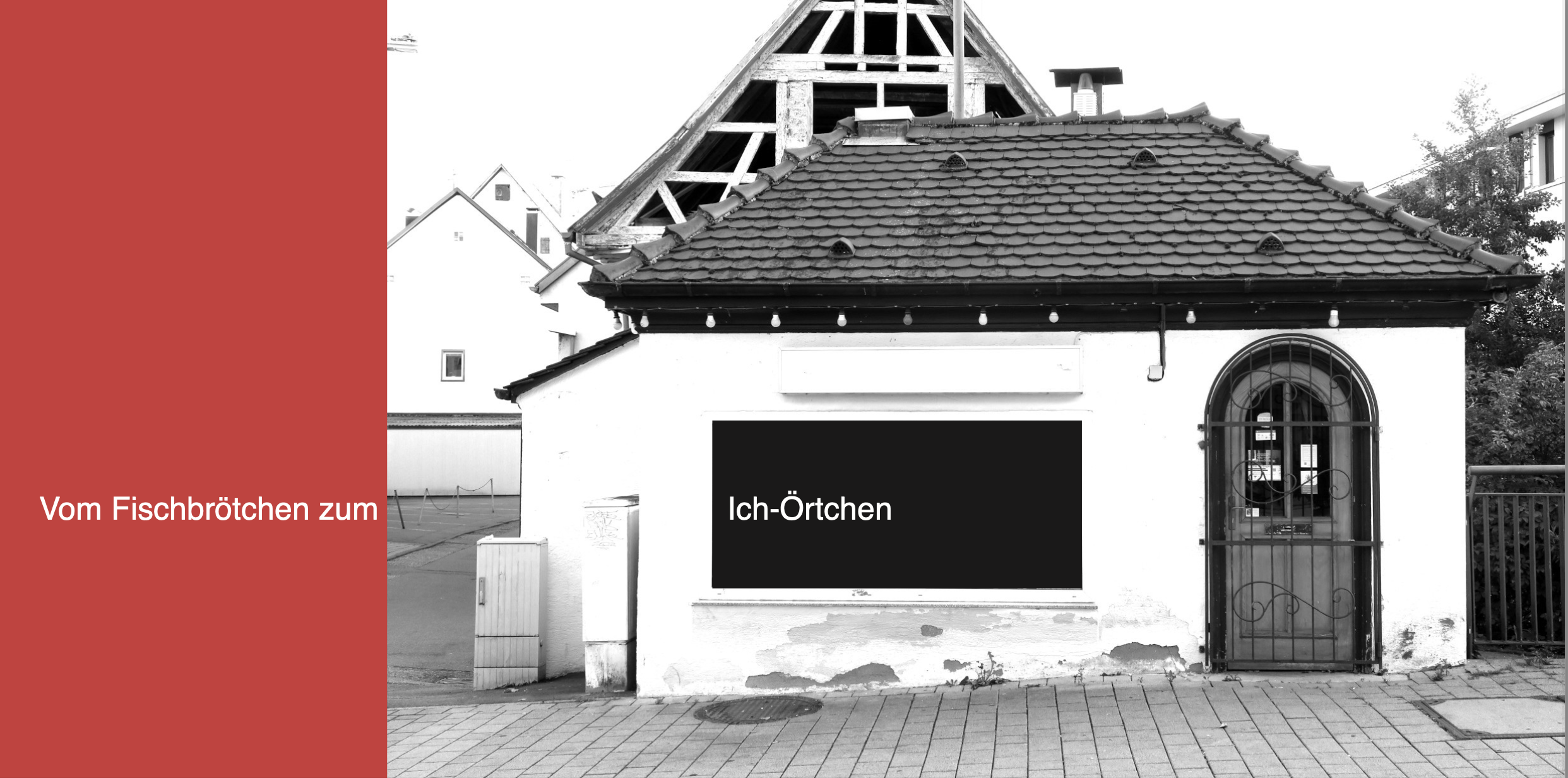 Ein kleines Häuschen – ein ehemaliger Imbiss in der Fußgängerzone von Kirchheim/Teck – wird für circa sechs Wochen in eine temporäre Mythos-Grill-Filiale unter dem Motto: „Vom Fischbrötchen zum Ich-Örtchen“ umgebaut. Dabei verwandelt sich das Gebäude selber in eine Art Plastik. Eine deutliche Setzung im Innenstadtbereich, die bei den Passanten Irritationen erzeugt, Neugier entfacht, aber auch Erinnerungen an die ursprüngliche Nutzung dieses zum Abriss verurteilten Häuschens weckt. Ein bisschen Rätselhaftigkeit ist dabei durchaus beabsichtigt. Jedes „Ich“ muss sich schließlich erstmal selbst finden …
