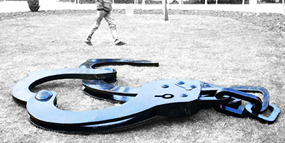 Bedeutung und Symbolik von Dingen der Alltagswelt reflektiert und inszeniert Guido Weggenmann in seinen künstlerischen Arbeiten. Dieses Zusammenspiel von Kunst und Leben umfasst auch die inhaltliche und emotionale Auslotung von Freiheitsvorstellungen des Einzelnen, Erfahrungen des Gefangenseins und persönlicher Einschränkungen. Impliziert ist ebenso die Möglichkeit des Ausbrechens. Daran knüpft der Künstler Überlegungen zur Freiheit bzw. Unfreiheit zeitgenössischen Kunstschaffens. Sein Sinnbild für diesen existentiellen Gedanken- und Gefühlsraum sind die überdimensionierten Handschellen aus Stahl, die als Bodenskulptur im Bürgerpark noch bis Mitte Januar zu sehen ist.