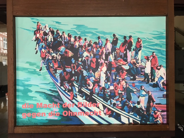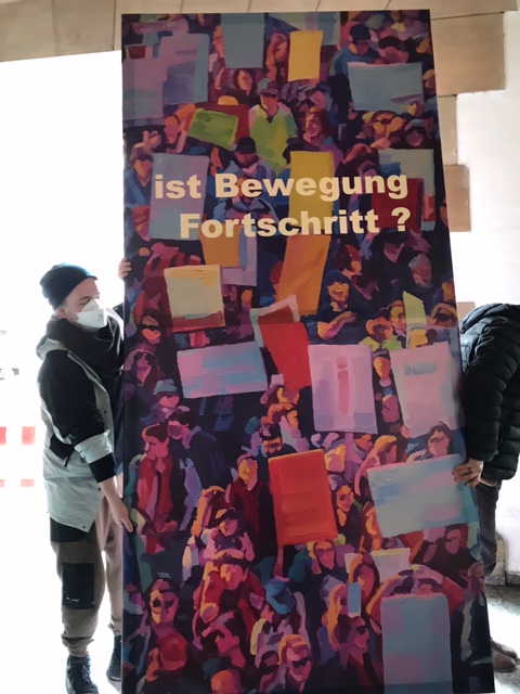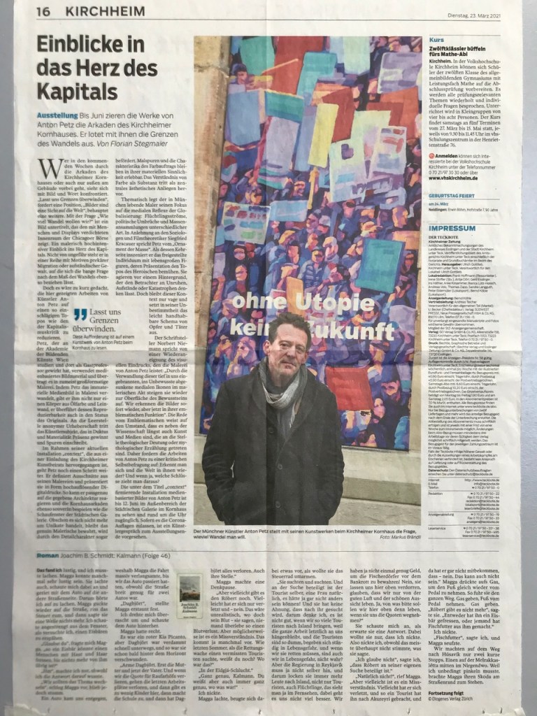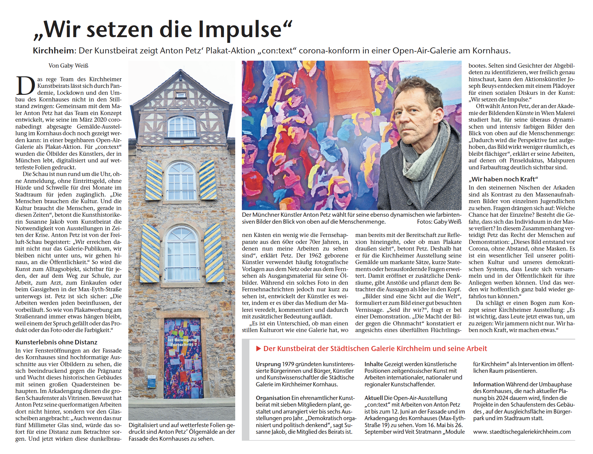 Anstatt die gemalten Bilder im Ausstellungsraum der Städtischen Galerie zu zeigen, überträgt Anton Petz seine Bildmotive mittels digitaler Verfahren auf großformatige Planen und versetzt die gesamte Ausstellung „coronagerecht“ in die Arkaden des Kornhauses. Für drei Monate verwandelt der in München lebende Maler diesen architektonischen Kontext in eine begehbare Open-Air Galerie. Auf zwei voneinander getrennten räumlichen Ebenen werden gesellschaftspolitisch brisante Fragen mit Bildern von globalen Konflikten, demonstrierenden Massen und schicksalshaft zusammengeworfenen Menschengruppen kombiniert, die sich als sprachlose Individuen selbst organisieren und denen der Künstler Gehör und Sichtbarkeit verleiht. (Susanne Jakob)