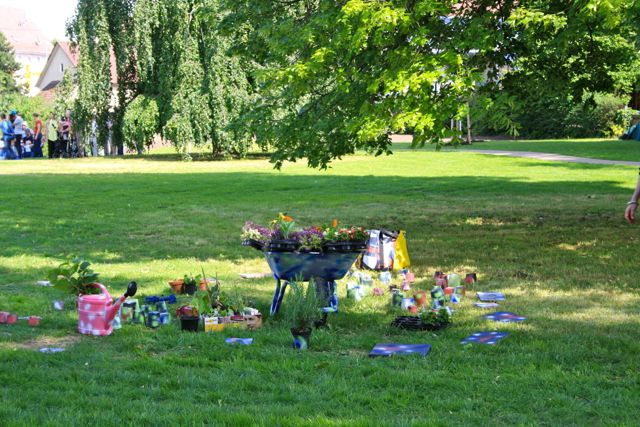 Erkennungsmerkmal: Kerstin Schaefer steht an einer bunten Schubkarre mit einer rosa Giesskanne ganztags im „Hain der Kulturen“ und nimmt Pflanzen in Töpfchen entgegen und gibt sie an Passanten weiter. Hier ist Platz für jeden und auch für Gespräche und Geschichten. Die Schubkarre wird als Ort des Pflanzentausches auch nach dem Eröffnungstag stehen bleiben.