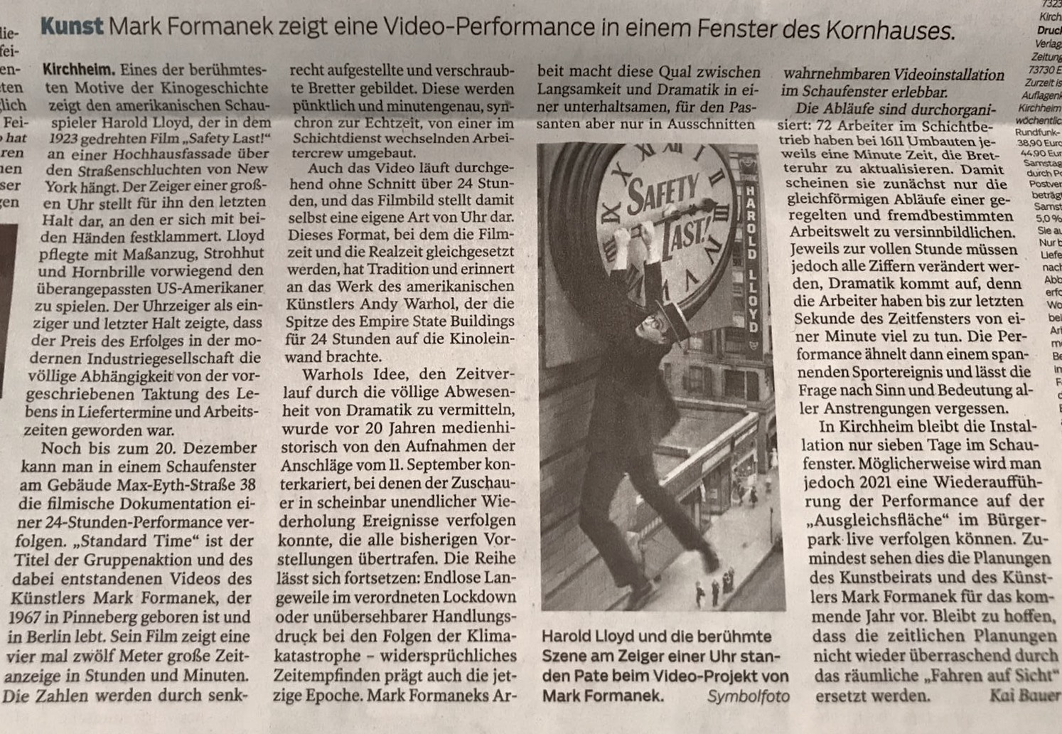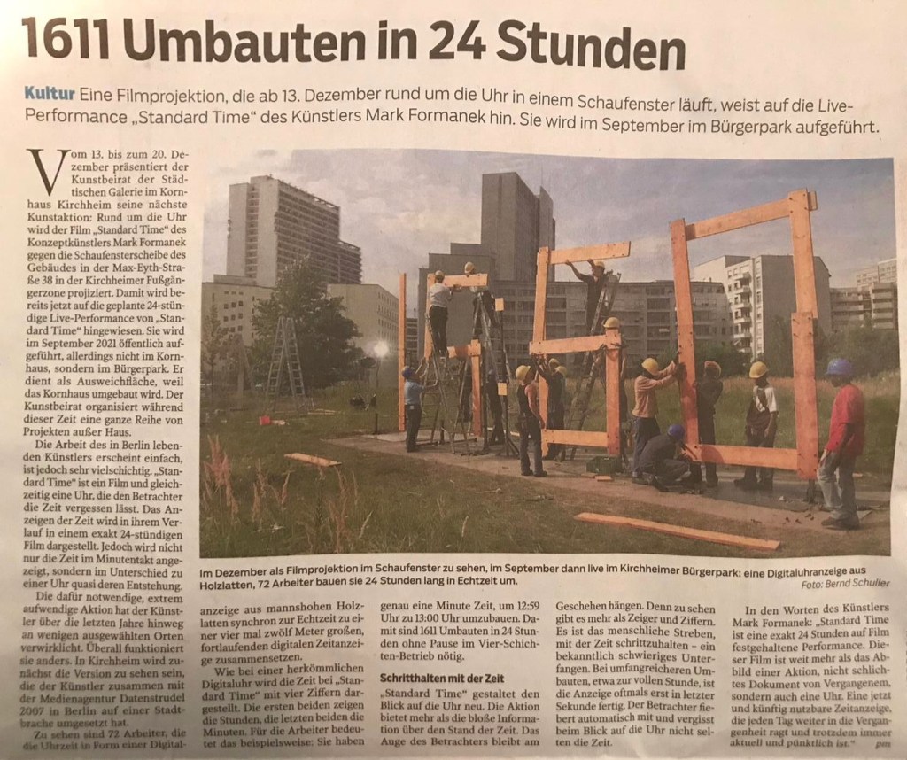 Standard Time ist die Dokumentation einer 24-stündigen Performance des Berliner Künstlers Mark Formanek. Parallel zur Echt­zeit fertigten im Jahr 2007 siebzig Akteure eine 4 x 12 Meter große fort­lau­fen­de di­gi­ta­le Zeit­an­zei­ge aus Holz­bret­tern: 1611 Um­bau­ten in 24 Stun­den, die lü­cken­los auf­ Video aufge­nom­men wurden. Wer sich Stan­dard Time an­sieht, sieht eine Uhr­zeit, aber auch Men­schen, die diese Zeit­an­zei­ge bauen. So fallen die Entstehung der Zeitanzeige mit der Anzeige der (Real)Zeit im Video zusammen.