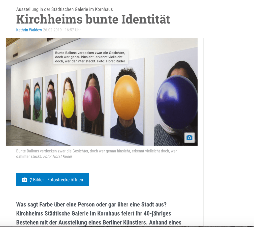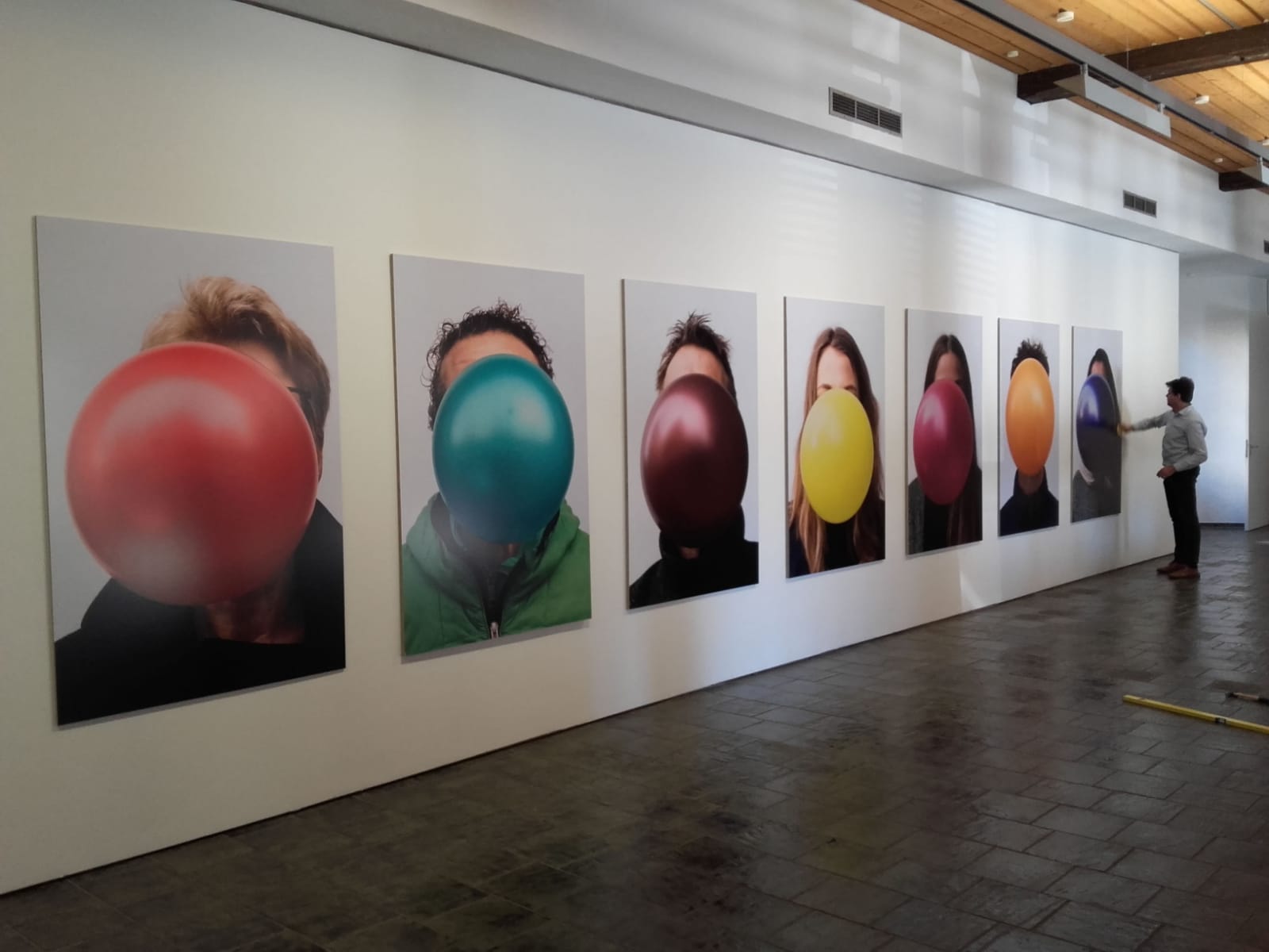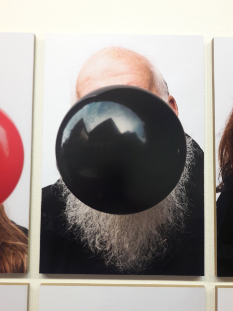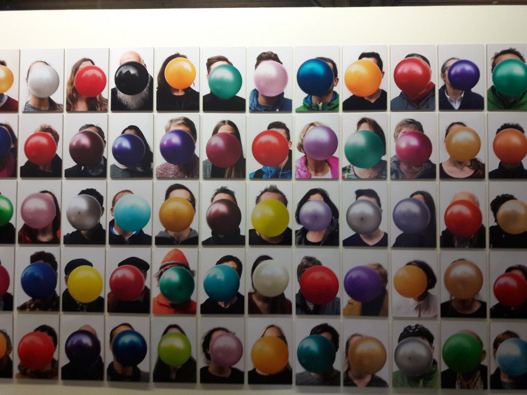 Das Besondere daran: Das jeweilige Gesicht wird durch einen farbigen Luftballon verdeckt, dessen Farbe jede/r Porträtierte als die für ihn/sie passende auswählte.