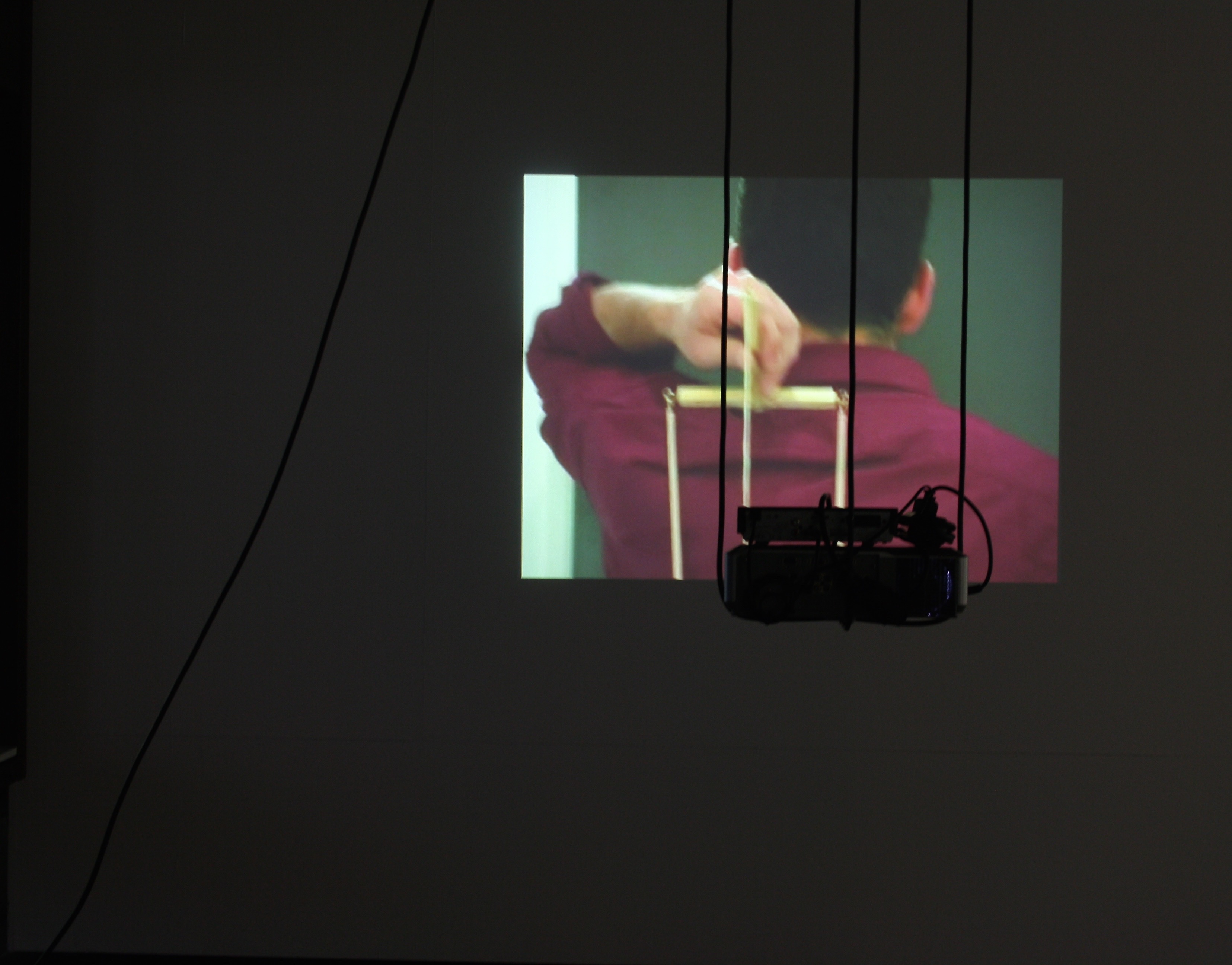 Der auf Bauchnabelhöhe abgehängte Beamer im hinteren Ausstellungsteil zeigt eine Kamera, die sich im Spiegel selbst filmt. Sie hängt dabei an einer Art Marionettengestell auf dem Rücken einer Person herab, die möglicherweise der Künstler selbst ist. Der Körper als Ganzes oder Hände als Körperteile werden in den Videos zu Objekten reduziert. Sie zeigen kaum den subjektiven Ausdruck oder die innere Bewegung, die normalerweise das Genre der künstlerischen Performance, von Tanz oder Schauspiel ausmachen. Konrad Mühe setzt den menschlichen Körper dezidiert als Element der bildenden Kunst ein, wie er auch das Medium Video extrem reduziert, indem er die Handlungsabläufe immer nur als kurze Schleifen zeigt, die mechanisch zu ihrem Ausgangspunkt zurückkehren.
