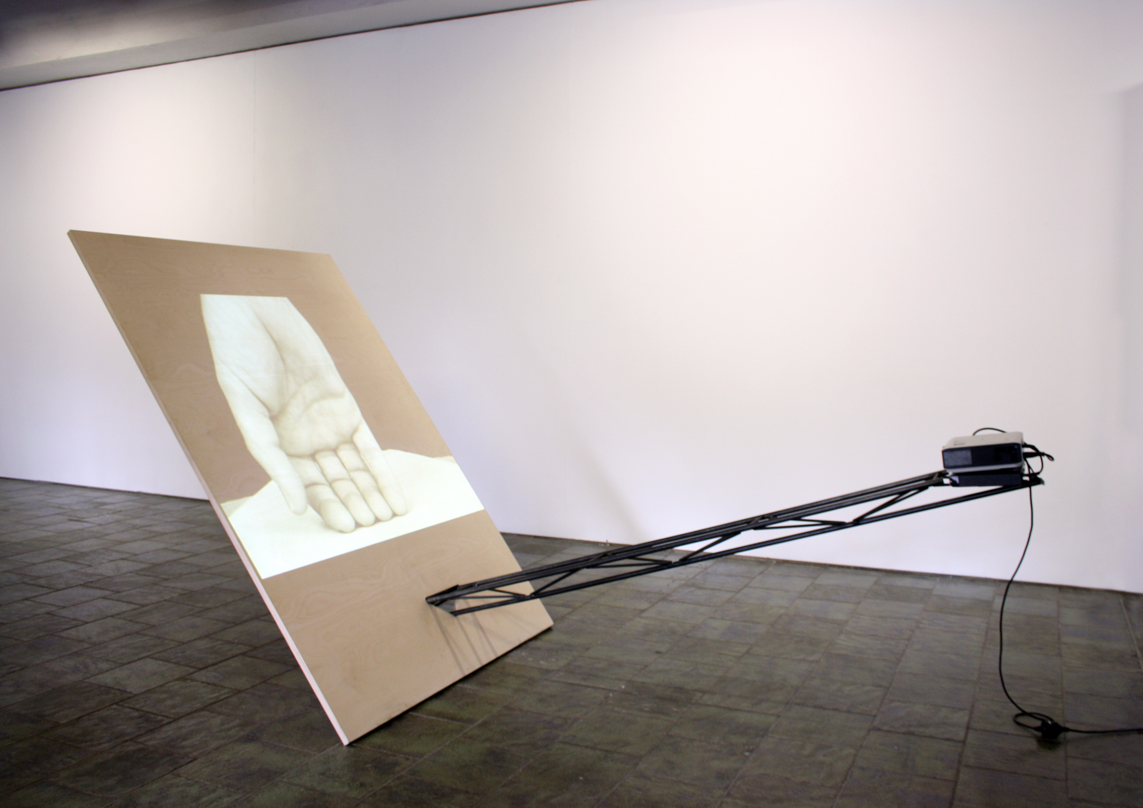 Schon beim Betreten der Ausstellung wird der Besucher mit einer großen Holzplatte konfrontiert, die schräg im Raum aufgestellt ist und eine Art balancierende Wippe mit einer Stahltraverse bildet, auf der ein Videobeamer befestigt ist. Man steht also auch als Betrachter „weiter hinten“, denn man muss zuerst die seltsamen Konstruktionen im Raum entschlüsseln, um an das bewegte und meist farbige Bild heranzukommen. Dieses bildet jeweils den Köder, der den Betrachter wie eine flimmernde Belohnung im Aufbau eines Laborversuchs anlockt.