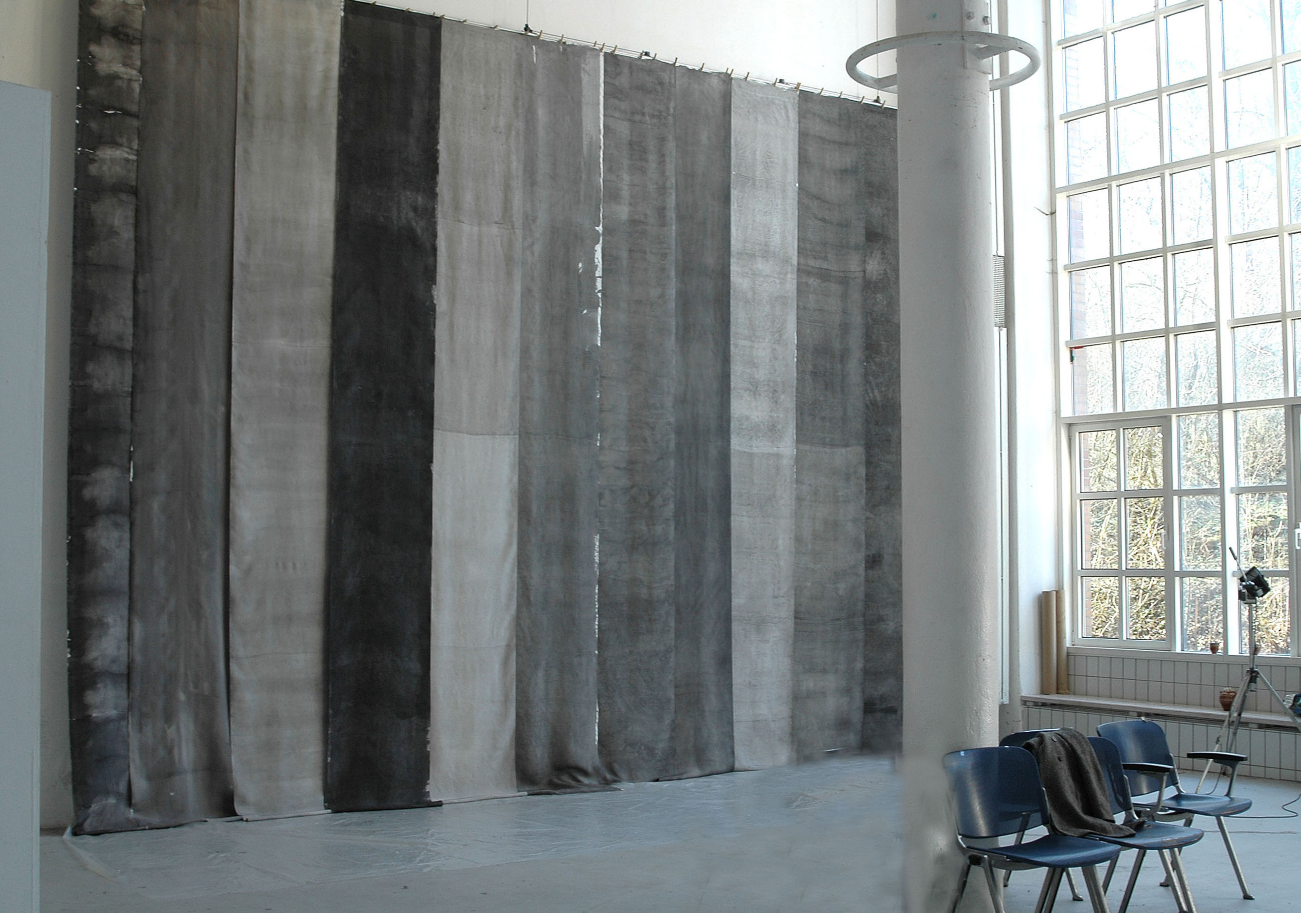 Im Zentrum der Ausstellung steht eine überlebensgroße Installation aus Seidenbahnen, die die Illusion von dünnen Wänden und filigranen (Sicht)Barrieren erzeugen. Das leichte schimmernde Seidengewebe wird durch die Bearbeitung mit Tusche zu schiefergrauen Trennlinien transformiert, die – ähnlich asiatischen Paravents (Byobu) – Bildträger und Raumteiler zugleich sind.